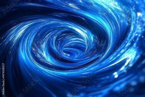 • Vibrant abstract artwork featuring dynamic blue whirl patterns and fluid movement --