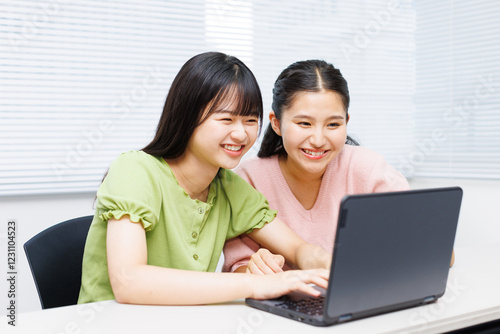sweet, training, indoor, portrait, asia, japanese, people, two people, young, youth, woman, lovely, deal, student, junior, class, lesson, study, study, schooling, casual clothes, laptop, smile, happy, together