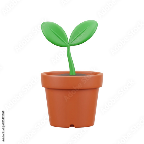 3D plant sprout icon in a terracotta pot. 8K render symbolizing growth and nature, isolated on a white background.