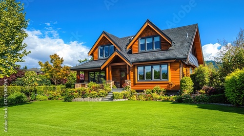 classical, house, grey, roof, brown, wooden, door, window, green, vegetation, surrounding, lush, tree, natural, peaceful, harmony, traditional, design, pointed, chimney, prominent, lawn, front, yard, trimmed, neat, empty, no, object, people, scene, tranquil, calm, architecture, style, elegant, landscape, rustic, charme