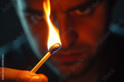 A burning match alongside a man, symbolizing the fragile nature of patience and self-control.