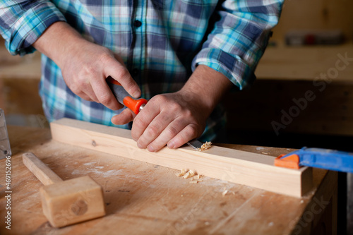A carpenter in a plaid shirt works a workshop. Wood. Ecological compatibility. Lifestyle. Close up.