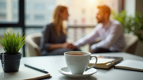 A close-up of a psychologist’s desk with a cup of tea, a notebook, and a small plant, with a patient sitting in the background, speaking openly about their feelings.