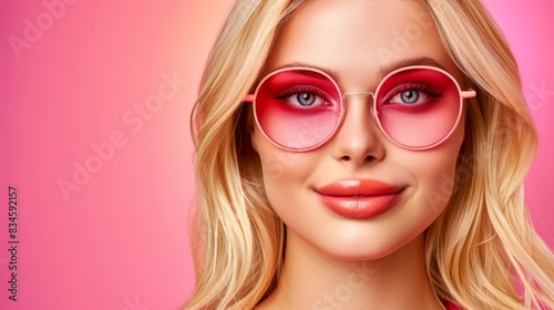 A close-up of a woman in pink sunglasses against a pink backdrop