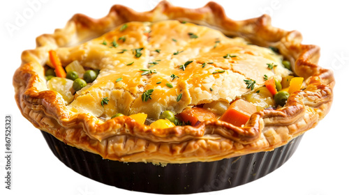A close-up shot of a veggie pot pie, its crust gently cracked to reveal colorful vegetables inside, isolated on a transparent background