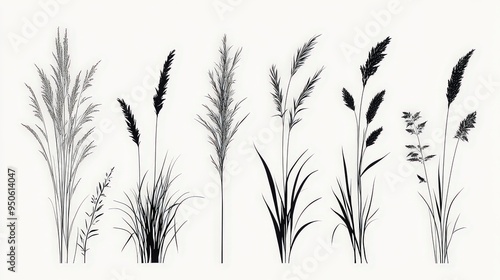 A collection of tall grasses in various forms and stages, depicted in black and white, emphasizing their natural beauty and simplicity.