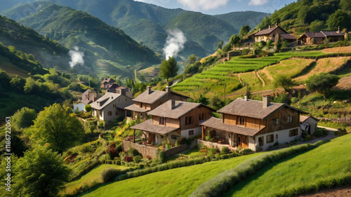 village, landscape, mountain, house, mountain, nature, vale, forest, view, europa, travel, green, alps, summer, sky, house, rural, tree, architecture, town, building, meadow, grass, tree, alpine