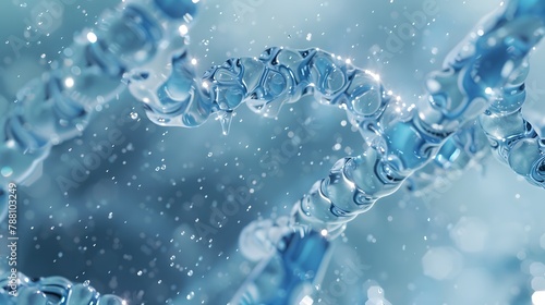 A creative representation of a DNA chain emerging from clear water, visualized in a close-up, symbolizing life and purity.