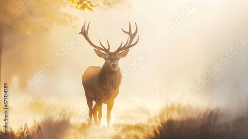 A deer stands in a forest, sunlight filtering through tree branches above, fog softly enshrouding the atmosphere