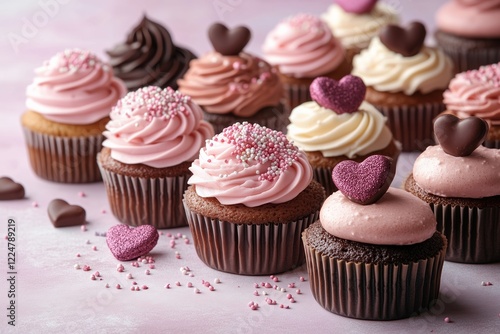 A delightful assortment of chocolate cupcakes decorated with swirls of pink frosting, heart-shaped toppers, and festive sprinkles.