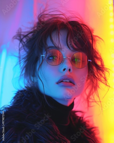 A dynamic fashion portrait of a woman with tousled hair wearing reflective sunglasses, illuminated by striking neon lights in blue and pink
