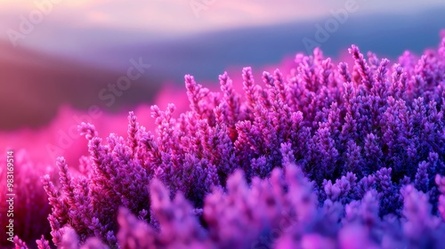 A field filled with purple flowers Behind them, a blue sky Additionally, a pink hue tints the upper portion of the background, suggesting a sunset or sunrise scene