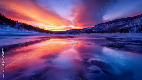 A frozen lake reflecting the vibrant colors of a winter sunset (3)