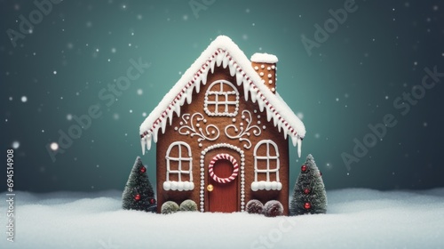 a gingerbread house with icing on the roof and trees in the snow on a green background with snowflakes.