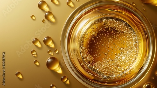 A gold countertop holds a glass bowl filled with liquid The bowl's underside and the surface of the water at its base display reflections, showing a golden hue