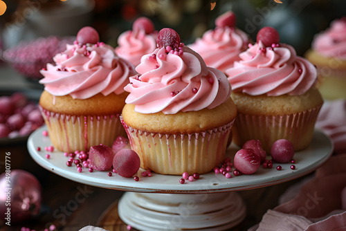 a group of cupcakes on a white cake stand. The cupcakes are light yellow in color and have a swirl of pink frosting on top