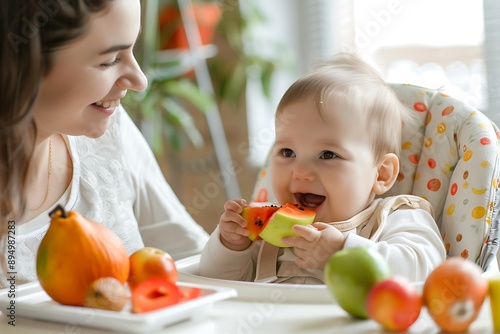 A happy infant sits in a highchair, enjoying fruits and interacting with their mother indoors