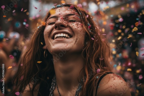 A joyful woman is seen laughing and having a great time while colorful confetti rains down on her at a festival Generative AI