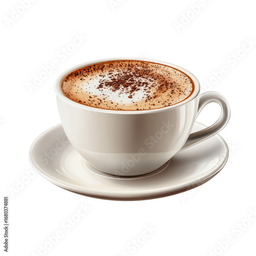 A meticulously captured cappuccino in a pristine white cup, showcasing the delicate balance of coffee, milk, and cocoa, embodies the pure essence of indulgence.