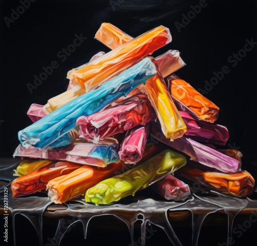 a painting of colorful candy sticks stacked on top of each other in front of a black background on a table.