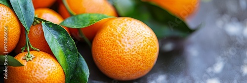 A pile of oranges on a table Nearby, a leafy green plant Both items reside on the table