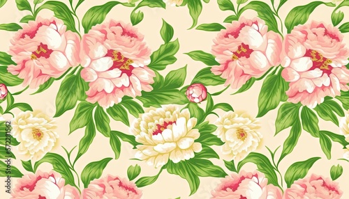 a pink and white flower pattern with green leaves on a beige background. generative ai