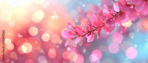 A pink flower, tightly framed, on a branch Background blurred with soft, radiant bokeh of light