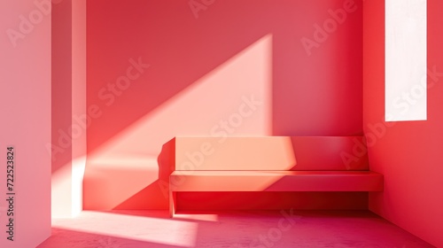 a pink room with a bench in the corner and a bright light coming through the window on the far wall.