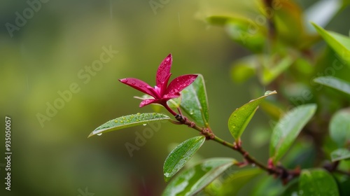 A red flower in focus on a tree branch, water droplets gleaming on leaves, background softly blurred