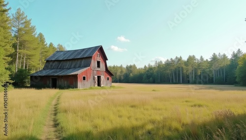 A serene rural scene with a rustic barn and tall grass