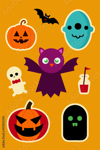 A set of cute Halloween stickers featuring pumpkins, bats, ghosts, and a spooky drink. These fun and festive stickers are perfect for adding a touch of Halloween cheer to your crafts, cards.