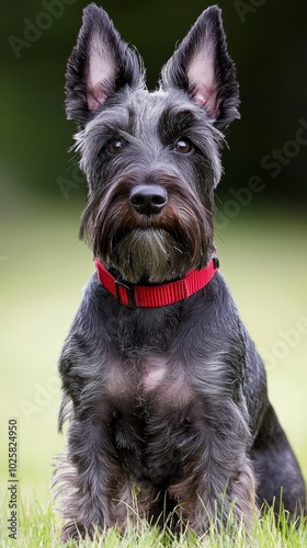 A small black dog wearing a red collar sits in the grass, gazing at the camera with a serious expression
