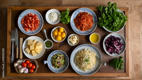 a top-down view of a well-organized kitchen, with fresh ingredients laid out on a wooden countertop