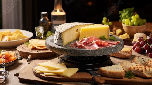 a variety of cheeses, meats, and breads are arranged on a platter on a table.