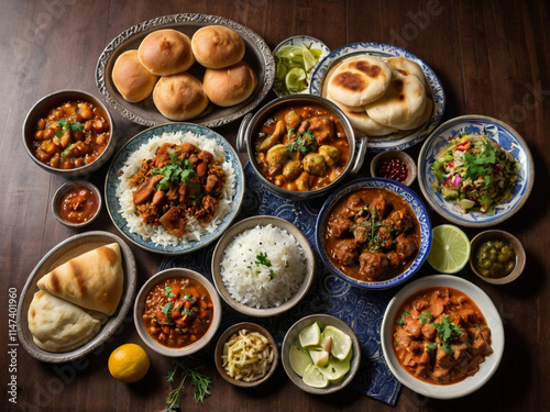 A variety of Middle Eastern or Mediterranean dishes including rice, stews, fried foods, and breads on a table