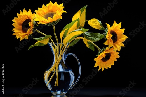 a vase filled with yellow sunflowers on top of a black table next to a glass vase filled with water.