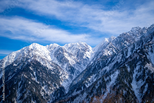 富山県立山町、上市町にある剱岳を見るために雪が積もる冬の中山を登山する風景 A view of climbing a mountain in winter with snow to see Tsurugidake in Tateyama and Kamiichi towns, Toyama Prefecture.