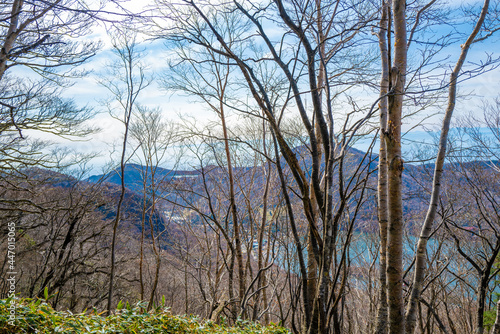 紅葉の季節の群馬県の赤城山の登山道の風景 A view of the trail at Mount Akagi in Gunma Prefecture during the season of autumn leaves.