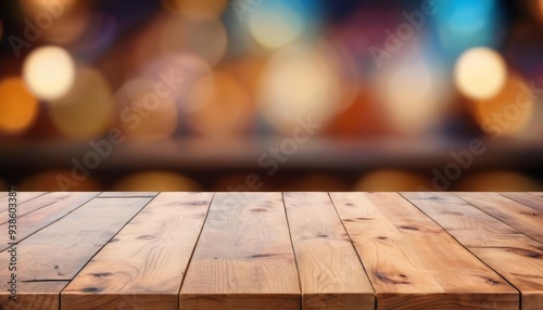 A warm inviting wooden table in focus against a vibrant bokeh background