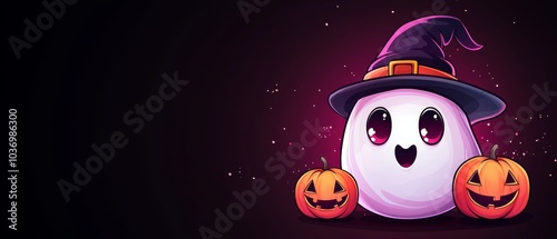A white ghost dons a black hat, holding two jack-o-lanterns