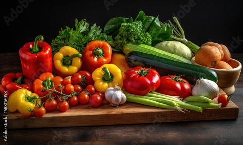 a wooden cutting board topped with lots of different types of vegetables. generative ai