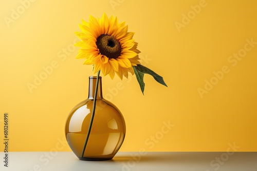a yellow vase with a sunflower sticking out of it's side, on a table, against a yellow background.