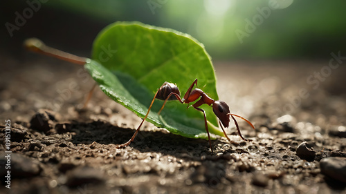 An ant carrying a large leaf, symbolizing hard work and determination.