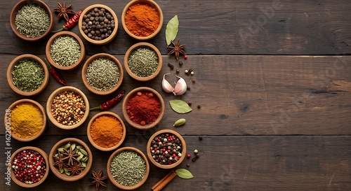 an assortment of vibrant spices and herbs artfully arranged in small bowls or on a rustic wooden surface, showcasing their colors and textures. amily meal, dinner, savory, pasta, casserole