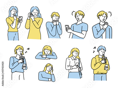 驚く男女のイラスト(迷う、、好奇心、悩む、お茶を飲む、心配) An illustration of a surprising woman peeping into it.Disturbed, questioned, curious, troubled, imagined, worried.