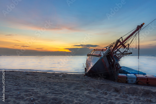 An old shipwreck or abandoned shipwreck, Boat capsized on the sand beach in beautiful colorful twilight sunset background with plastic tank movement