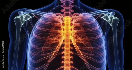 Anatomical 3D rendering of human torso with highlighted spine and ribcage