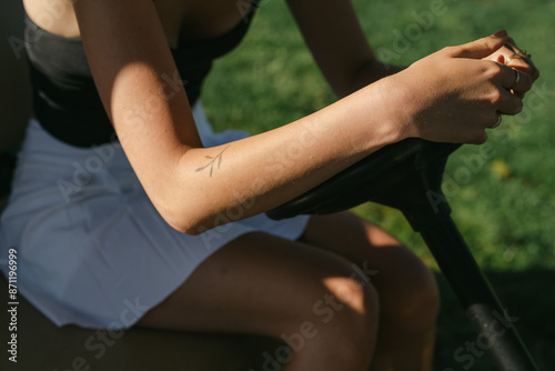 active, activity, anonymous, competition, couple, course, drive, driver, exercise, fairway, foot, field, foot, game, gear, golf, golf ball, golf cart, golf club, golfer, golfing, grass, hit, hobby, leg, leisure, morning, nature, outdoors, play, player, recreation, relax, shade, shadow, sport, spring, summer, sun, sunlight, sunrise, sunshine, swing, tattoo, teaching, tee, tee off, together