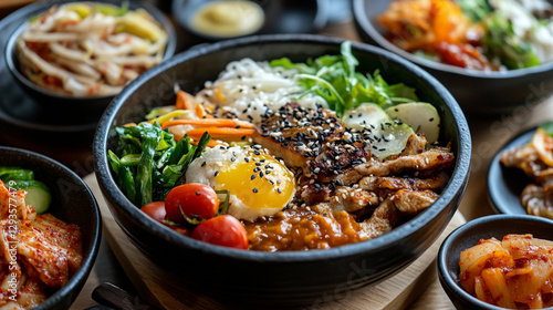 bowl, chicken, egg, asian, food, meal, lunch, tasty, fresh, spicey, sauce, healthy, dinner, cookery, japanese, korean, vegetarian, receipe, eatery, epicure, savoury, colourful, vegetable, noodle, sesame, plate, cooking
