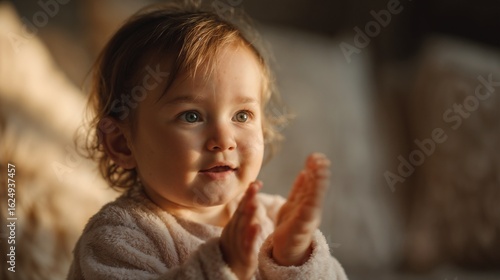 baby, applause, smile, hand, children, toddler, happy, cute, soft light, innocence, joy, indoor, adorable, sweet, playful, cosy, expression, childhood, baby girl, excitement, emotion, learning, gesture, warm light, family, parenting, cheerful, fun, small, morning, love, charming, softness, sunshine, natural light, development